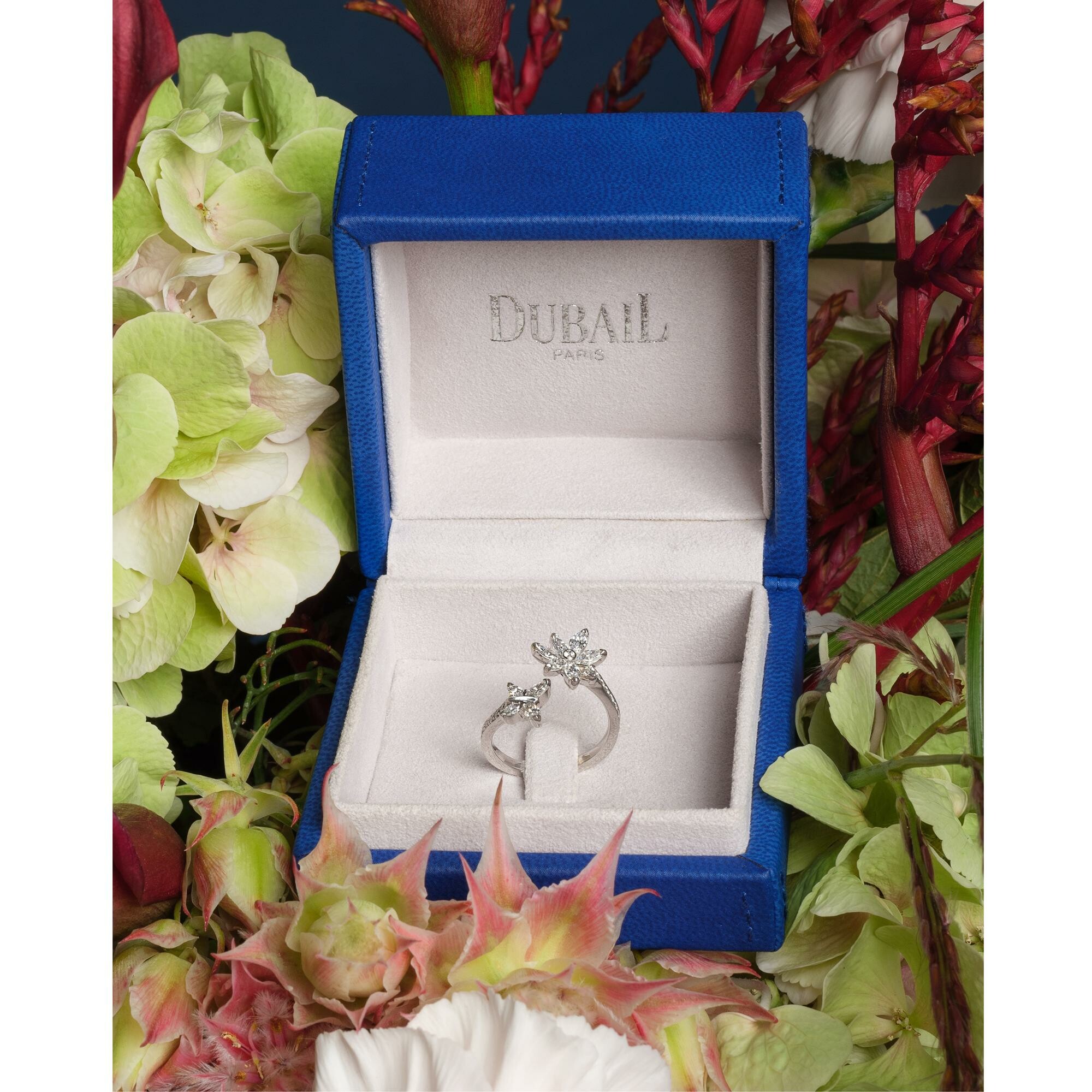 Toi&Moi Anémones & Papillons ring in 18-carat white gold made in our Parisian workshops composed of shuttle-cut diamonds and set with brilliant-cut diamonds. Maison Dubail combines the anemone, a delicate flower with fragile beauty, and the butterfly, a magical and enchanting creature to celebrate a wonderful nature and full of surprises. A symbol of eternal love, this ring is a precious reminder of the love and union between two people.