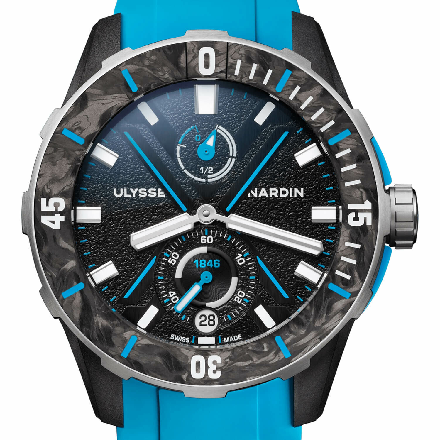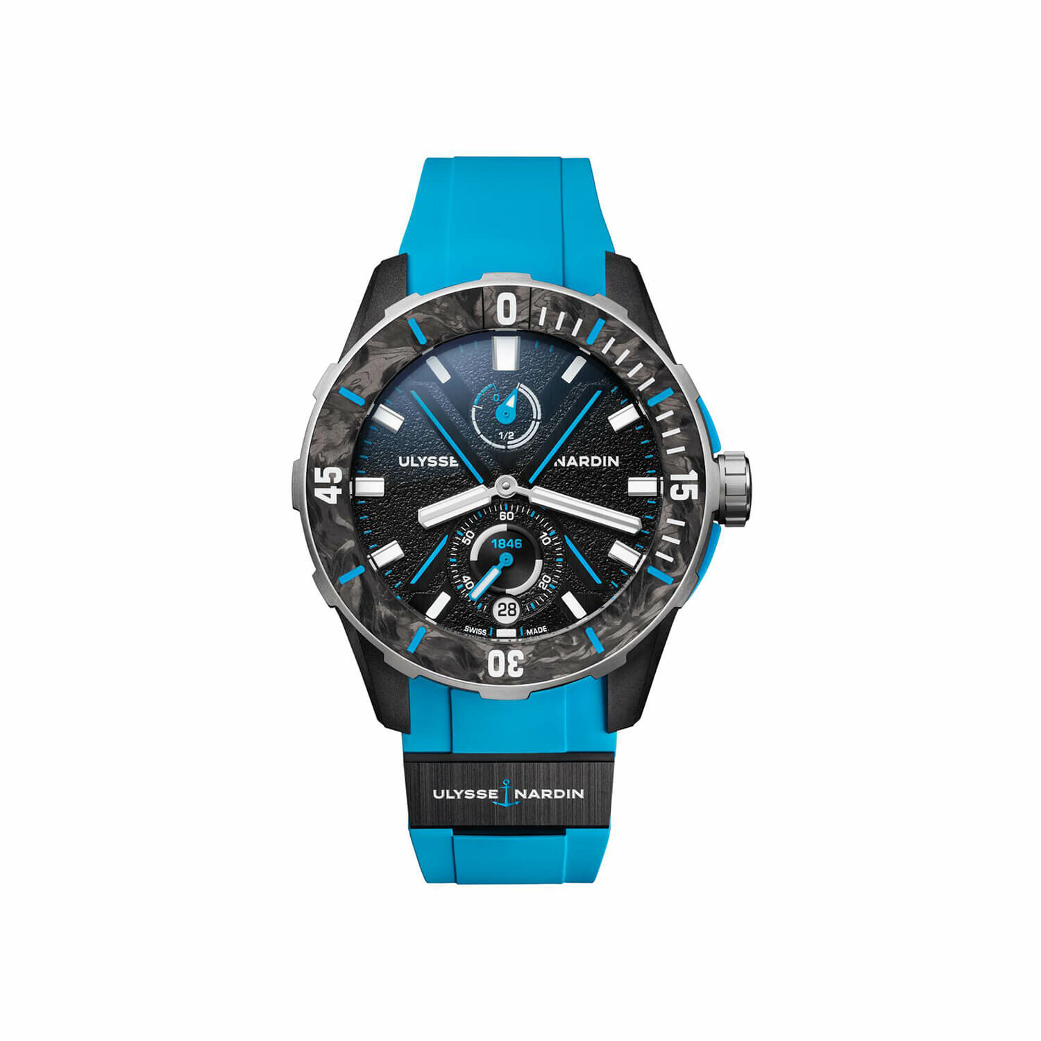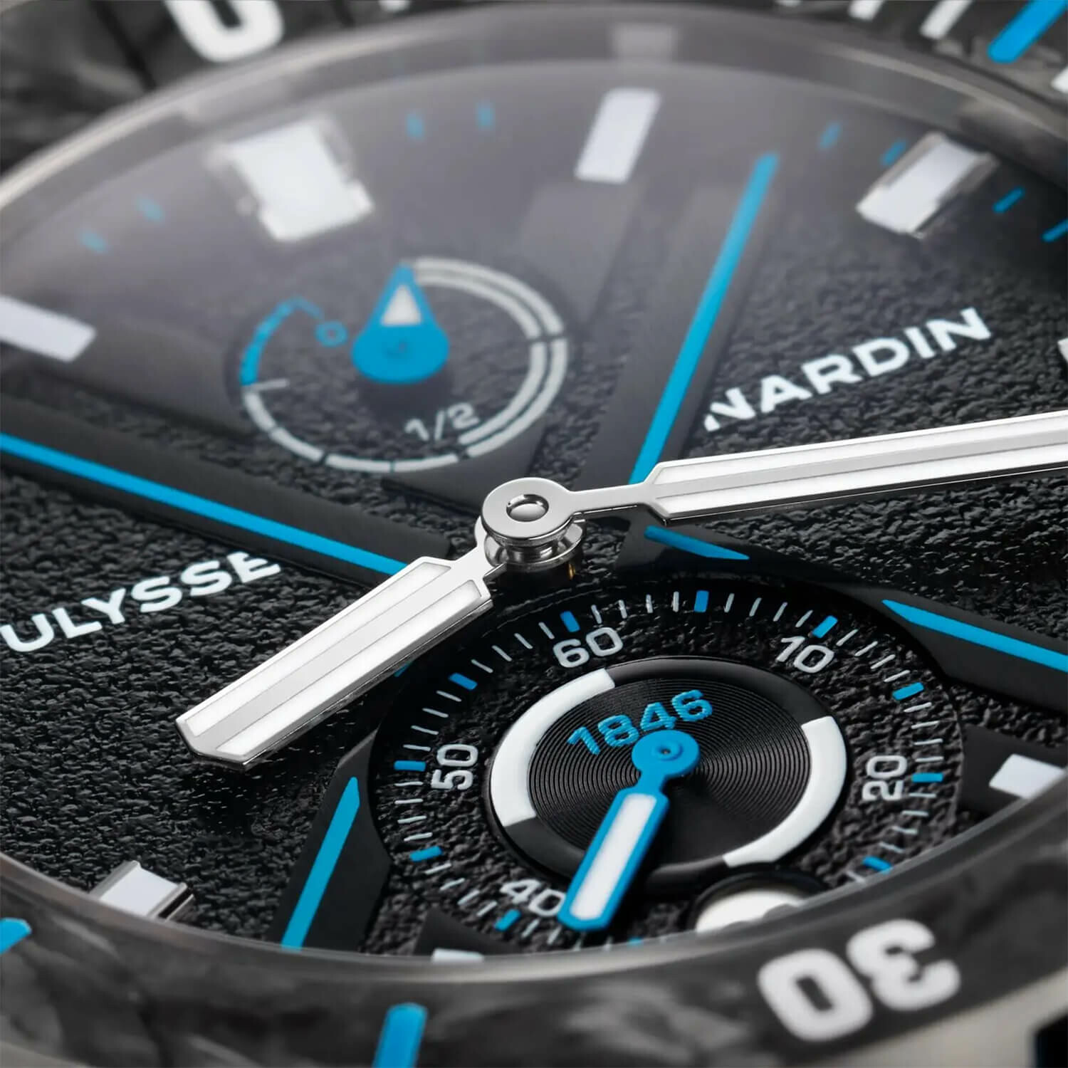 Case: 44mm I Manufacture Caliber UN-118 automatic - Silicon & DiamonSil components - 4Hz (28’800v/h) Hours & minutes I Date I Small seconds indicator I Power reserve indicator: 60h Side-parts & case-back: 60% Recycled Fishing net Nylo & 40% upcycled carbon fiber/carbonium Bezel: 100% upcycled carbon fiber/carbonium I Container: 85% recycled steel Fabric R-strap 100% recycled & recyclable I Water resistant: 300m I Screwed crown I Antimagnetic