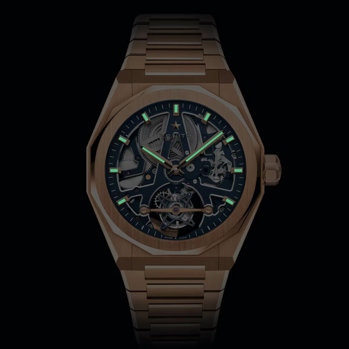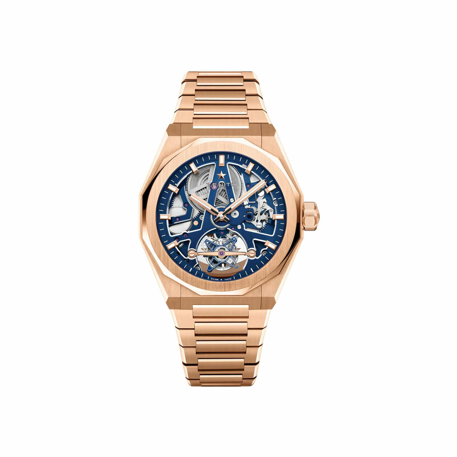 The DEFY Skyline Tourbillon pairs a 41mm rose gold octagonal case with a skeleton movement in intense blue. The El Primero 3630SK calibre features an openworked architecture embracing the ZENITH star as a structural motif, expanded and centred around the tourbillon.