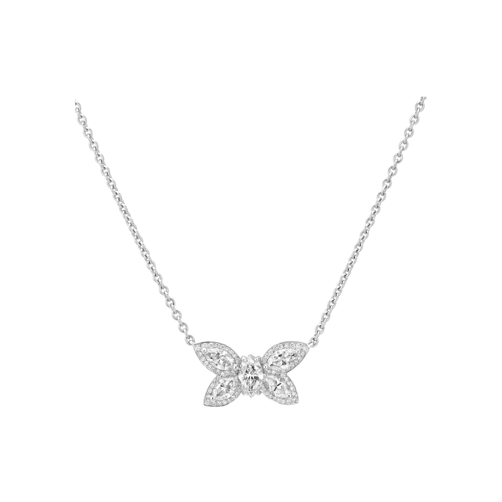 Ensuite, le pendentif Papillons révèle le savoir-faire délicat de la Maison dans sa collection éponyme. Créé en or blanc, le pendentif joue la légèreté et la transparence : deux ailes stylisées composées de quatre saphirs de taille poire, finement ciselées, semblent presque flotter sur la chaîne en or blanc. Le bleu des saphirs souffle une fraîcheur aérienne, tandis que la finition polie de l’or ajoute un halo soyeux. Ce pendentif incarne le vol silencieux du papillon, un motif cher à la Maison qui signe ici une interprétation résolument moderne et sophistiquée.