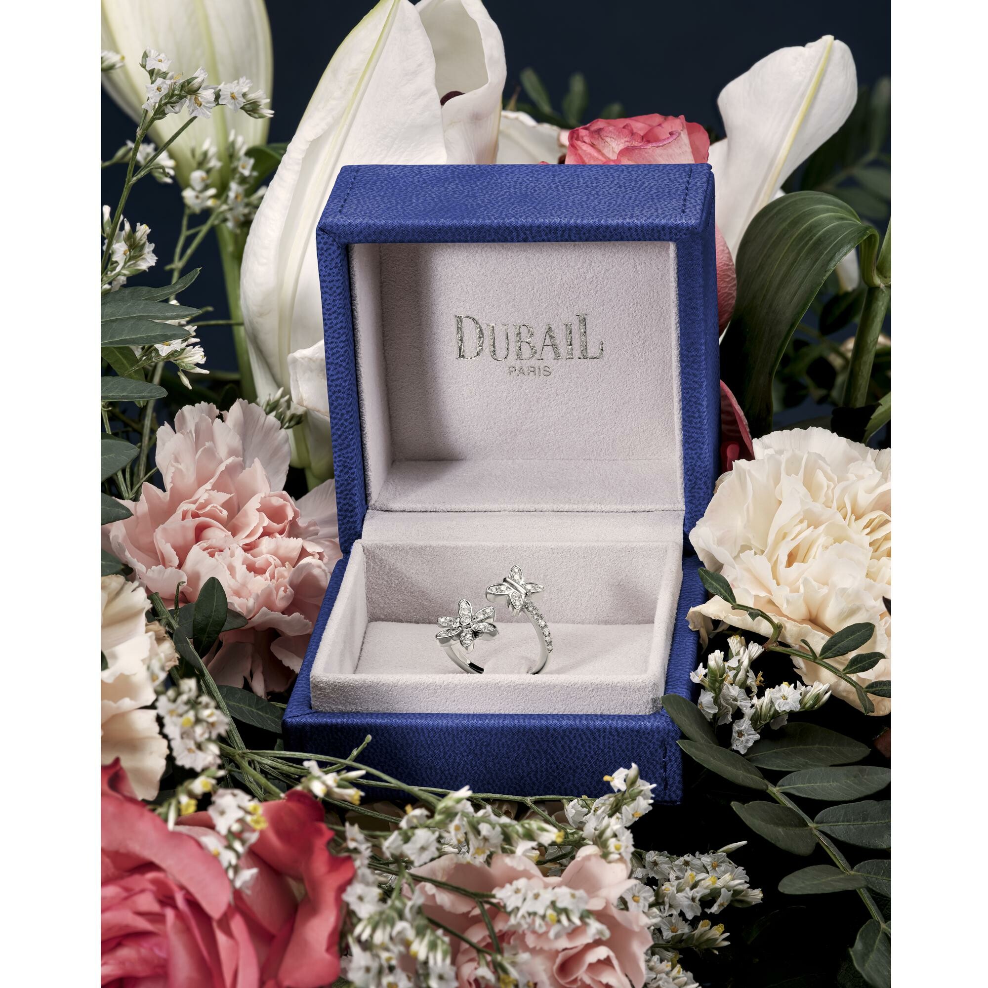 Bague Toi&Moi Anémones & Papillons en or blanc 18 carats réalisée dans nos ateliers parisiens composée de diamants taille brillant avec le corps sertie de diamants taille brillant. La Maison Dubail mêle l'anémone, délicate fleur à la beauté fragile au papillon, créature magique et enchanteresse pour célébrer une nature merveilleuse et pleine de surprises. Symbole d’amour éternel, cette bague est un rappel précieux de l’amour et de l'union entre deux personnes.