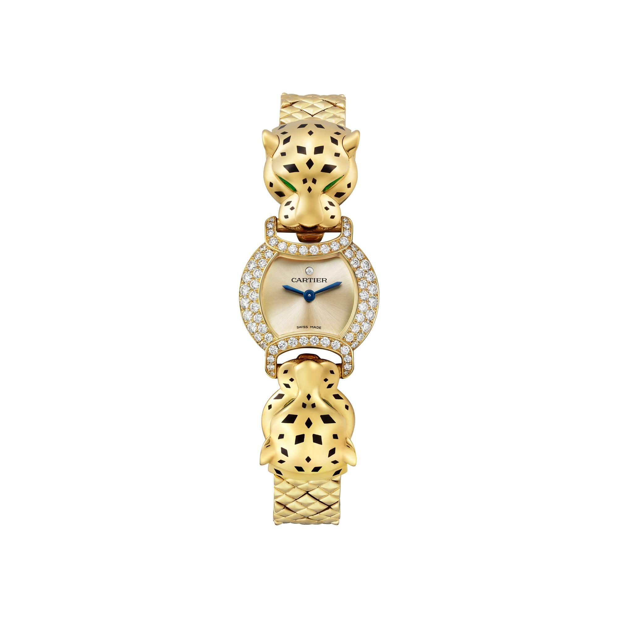 Montre La Panthère de Cartier, mouvement quartz. Boîte en or jaune 750/1000 sertie de 128 diamants taille brillant pour 1,08 carat, têtes de panthère en or jaune 750/1000, yeux en tsavorite taille poire, taches et truffe en laque noire, cadran couleur doré, aiguilles en forme de glaive en acier bleui, glace saphir, bracelet en or jaune 750/1000. Diamètre de la boîte: 22,2mm. Epaisseur : 7,55 mm. Etanche jusqu'à 3 bar (environ 30 mètres).
