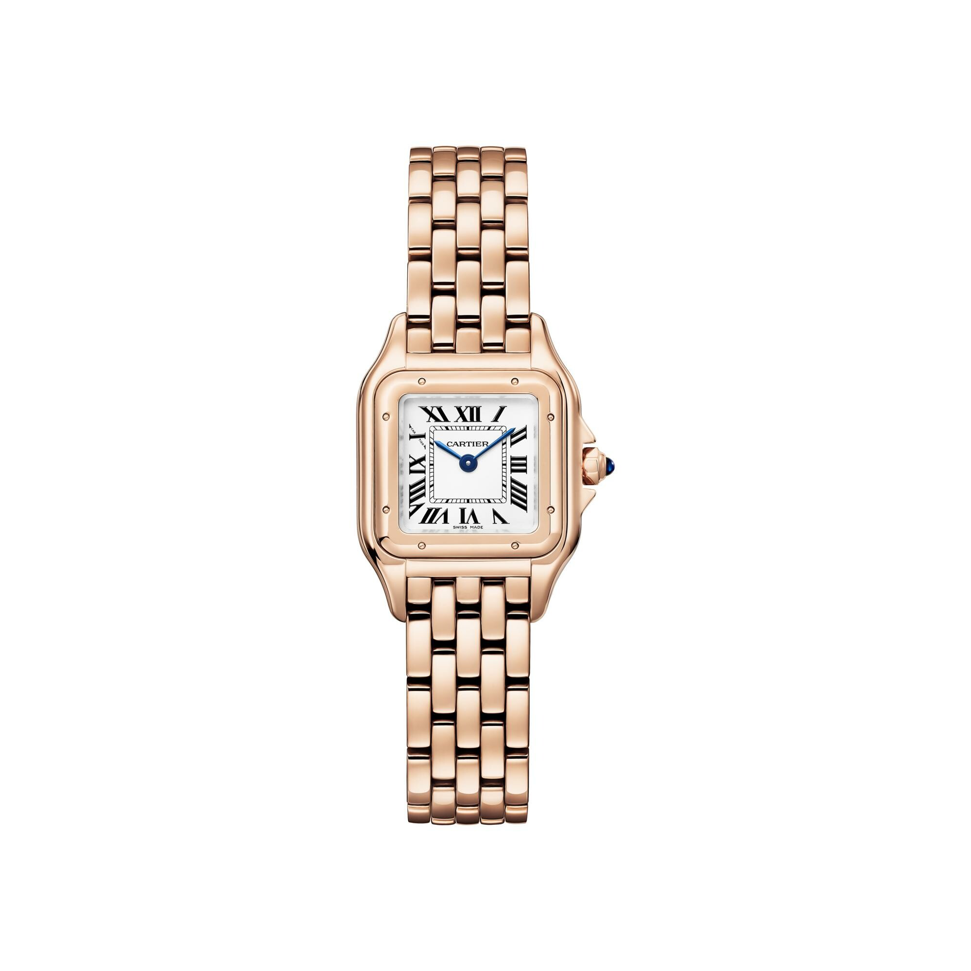 Montre Panthère de Cartier, petit modèle, mouvement à quartz. Boîte en or rose 750/1000, dimensions : 23 mm x 30 mm, épaisseur : 6 mm, couronne ornée d'un saphir bleu, cadran argenté, aiguilles en forme de glaive en acier bleui, bracelet en or rose 750/1000, étanche jusqu'à 3 bar (environ 30 mètres).