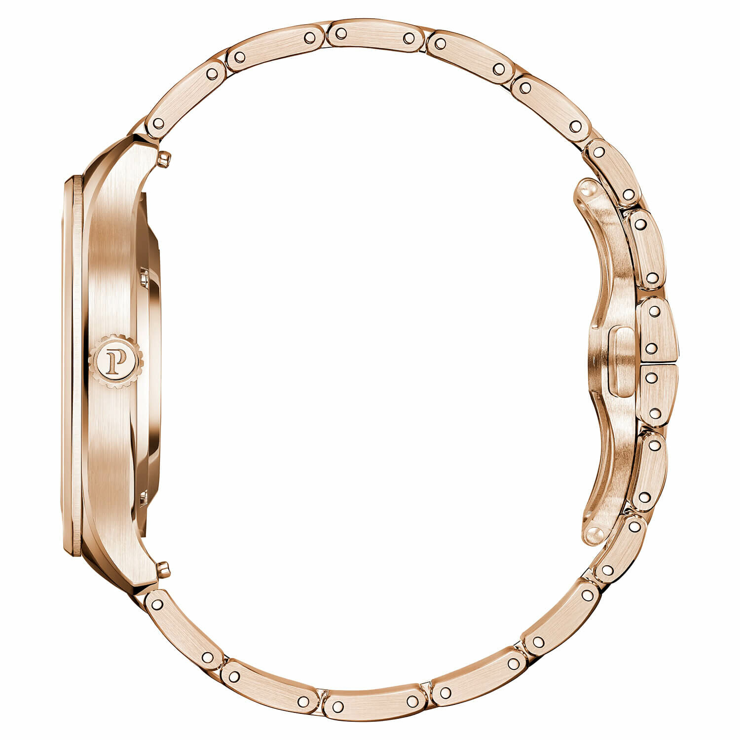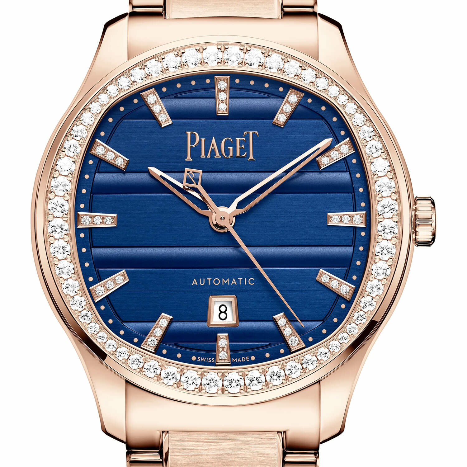 Montre Piaget Polo Signature Date, 36 mm. Boîtier en or rose 750/1000 serti de 60 diamants taille brillant (env. 0,97 ct). Cadran avec index en or rose 750/1000, serti de 36 diamants taille brillant (env. 0,07 ct). Bracelet interchangeable en or rose 750/1000. Montre livrée avec un second bracelet en caoutchouc bleu foncé et une boucle ardillon en or rose 750/1000. Fond de boîtier saphir. 500P1, Manufacture mouvement mécanique à remontage automatique.