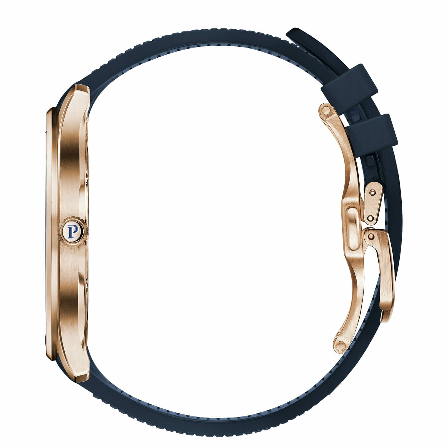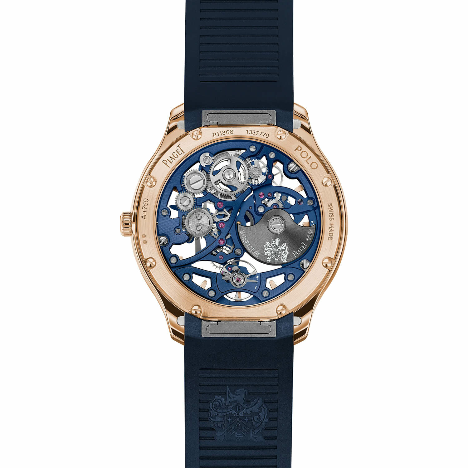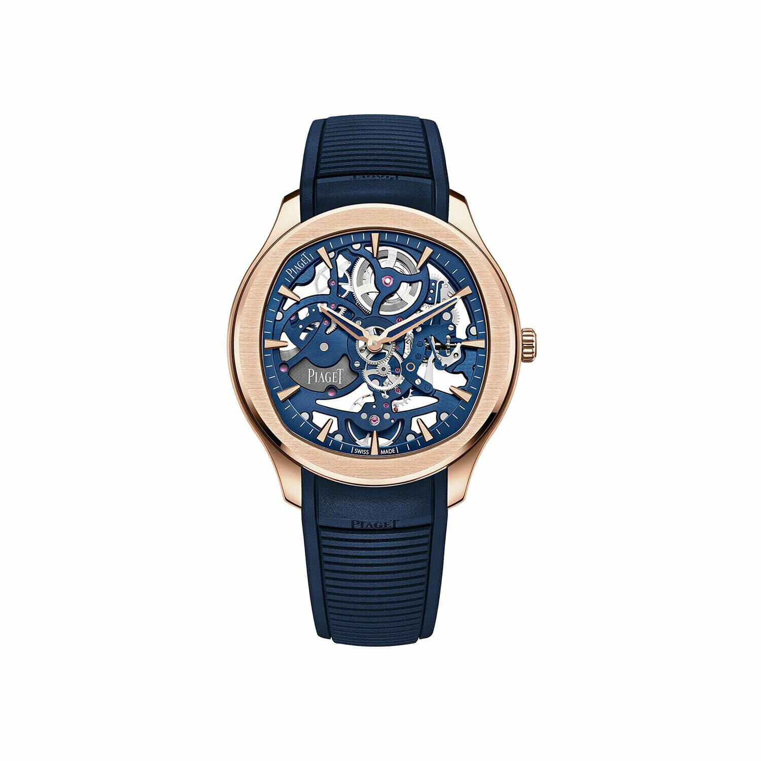 Montre Piaget Polo Skeleton, 42 mm. Boîtier en or rose 750/1000. Bracelet en caoutchouc bleu foncé interchangeable. Montre livrée avec un second bracelet en cuir de veau bleu. Fond de boîtier saphir. Mouvement mécanique squelette extra-plat Manufacture 1200S1 à remontage automatique (2,4 mm).