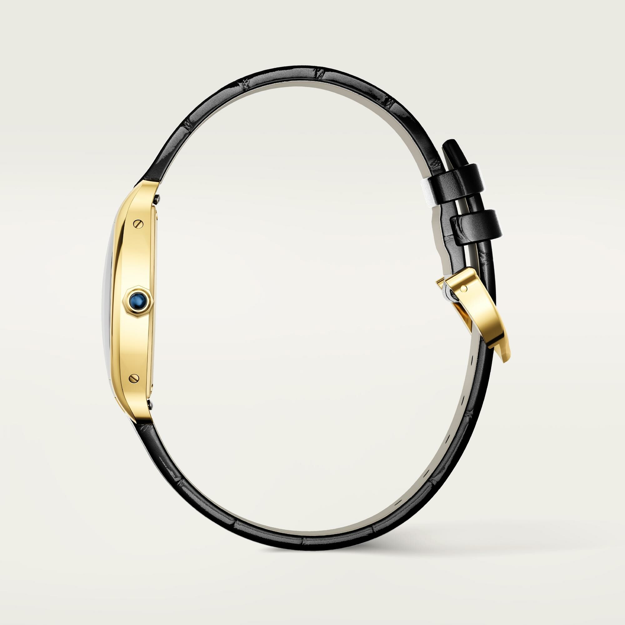 Montre Tortue, petit modèle, mouvement à quartz haute autonomie. Boîte en or jaune 750/1000. Couronne octogonale en or jaune 750/1000 ornée d'un cabochon de saphir. Cadran couleur champagne, aiguilles en forme de glaive à finition dorée, glace saphir. Bracelet en alligator noir brillant, boucle ardillon en or jaune 750/1000. Longueur: 33,4 mm, largeur: 26,7 mm, épaisseur: 7,2 mm. Etanche jusqu'à 3 bars (~30 mètres).