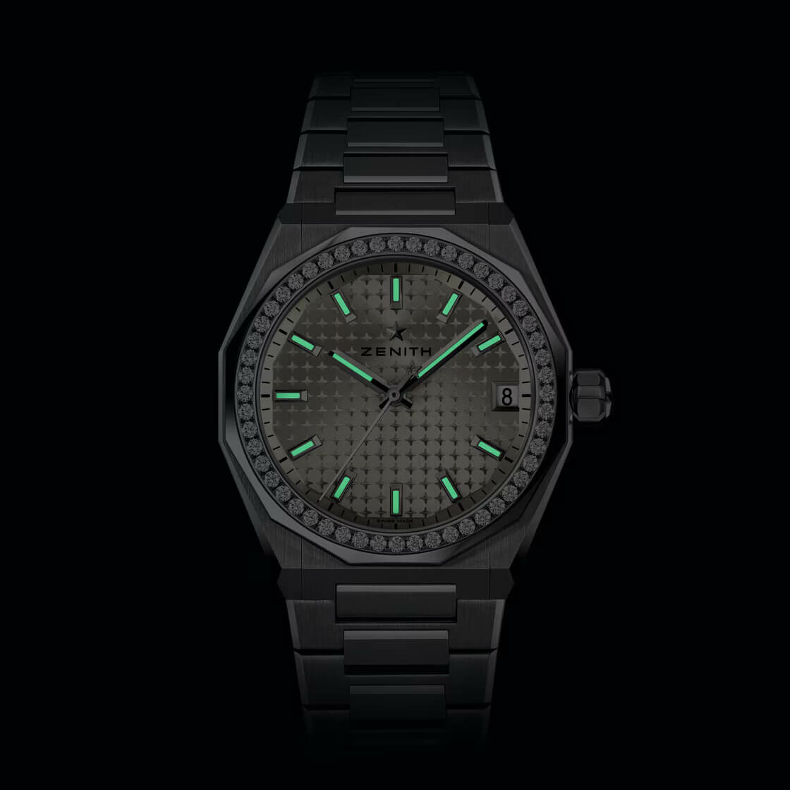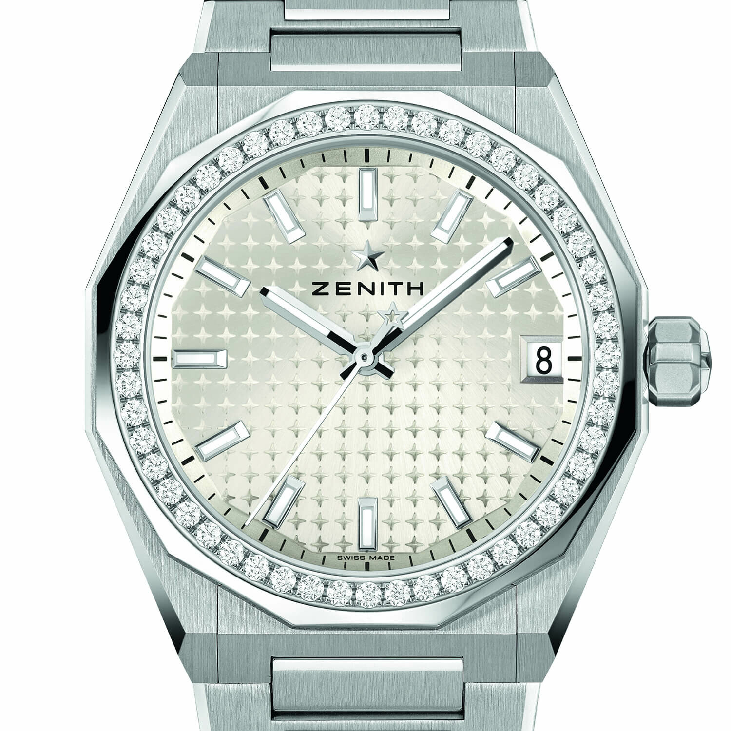 Montre DEFY Skyline dotée d’un boîtier octogonal de 36 mm en acier avec une lunette à facettes sertie de diamants. Son cadran soleillé argenté arbore un motif de ciel étoilé. Elle est animée par le mouvement automatique de manufacture Elite 670.