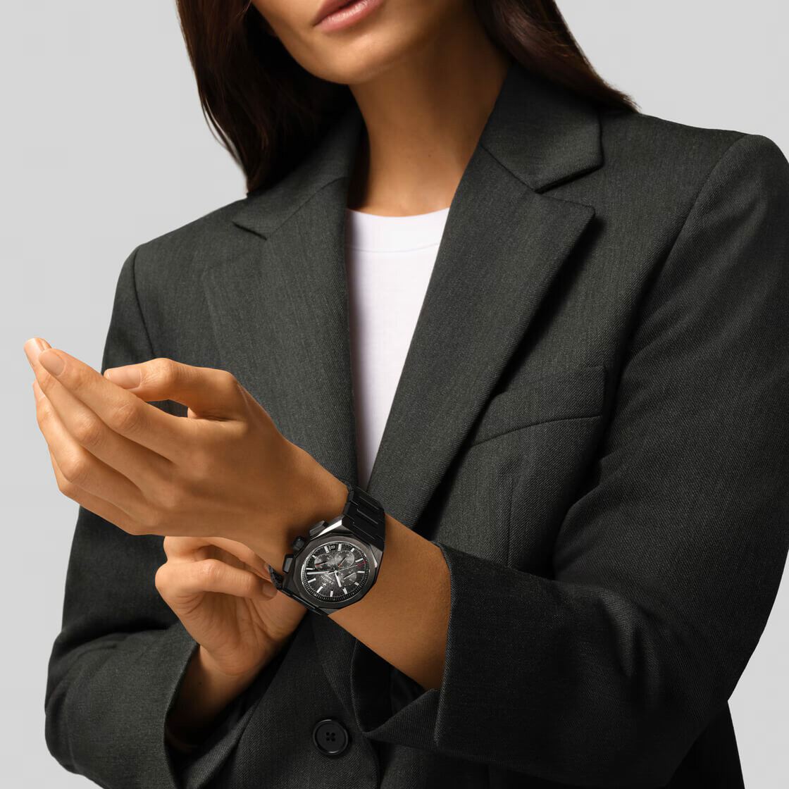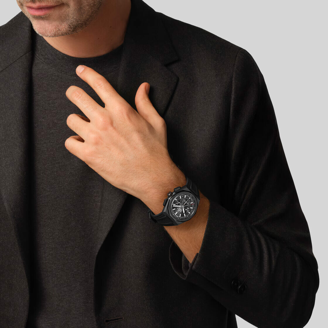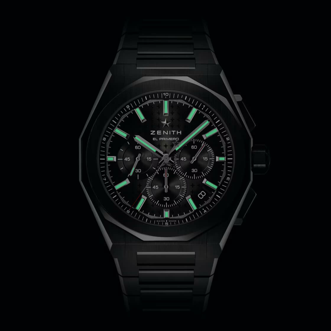 La DEFY Skyline Chronograph est dotée d’un boîtier octogonal de 42 mm en céramique noire avec lunette à facettes. Elle est animée par le mouvement de manufacture automatique El Primero 3600, un chronographe haute fréquence avec roue à colonne arborant le tout premier affichage des 1/10e de seconde.